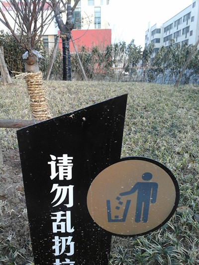 滿布園區(qū)公舍的“請(qǐng)勿亂扔垃圾”警示金屬提示牌邊角鋒利,原為溫馨提示,卻成了兒童玩耍時(shí)的安全隱患。